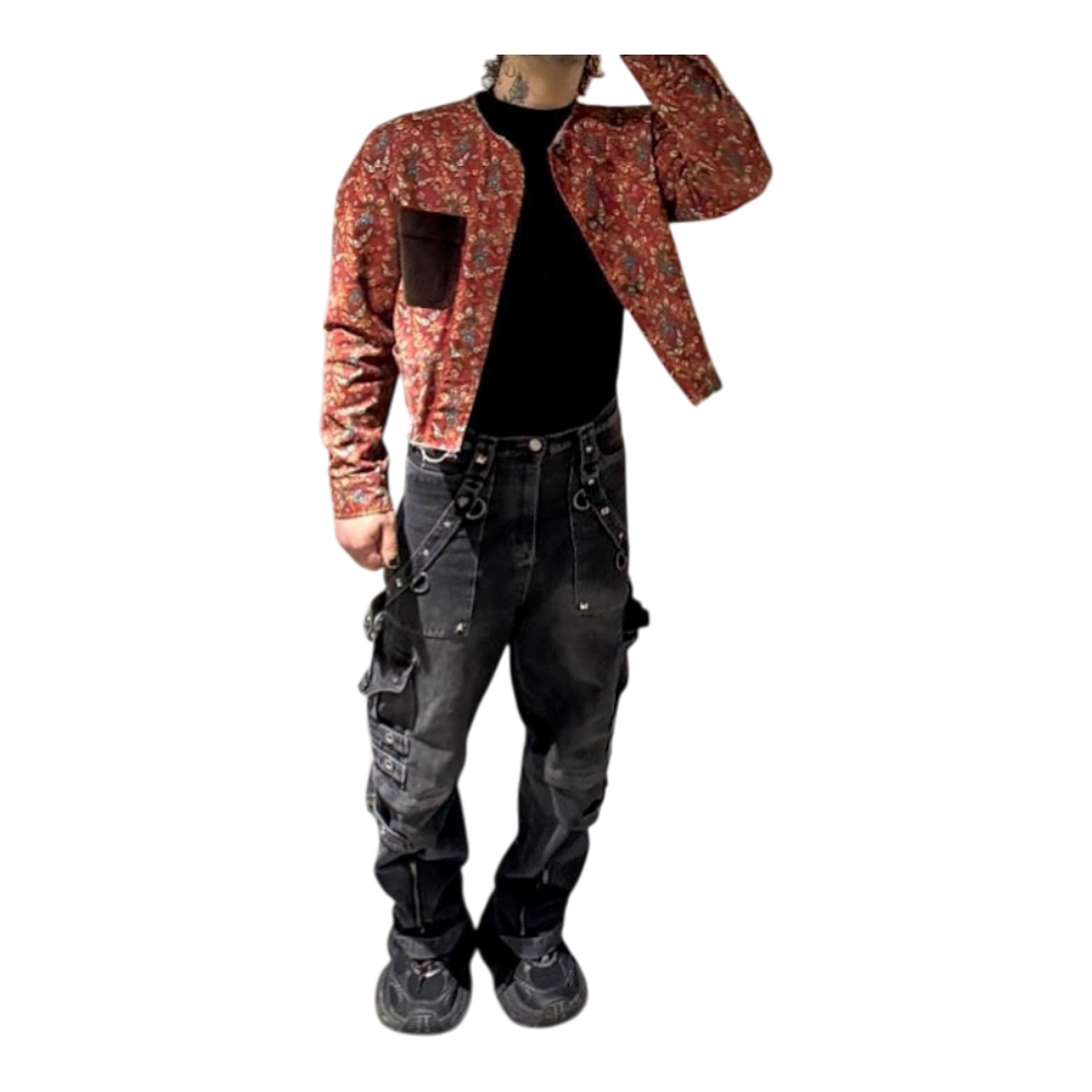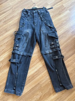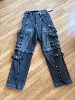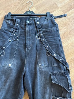Dark grey denim cargo jeans. Features studded straps, D-rings, and zippers at the ankles.