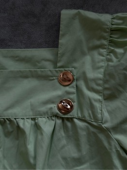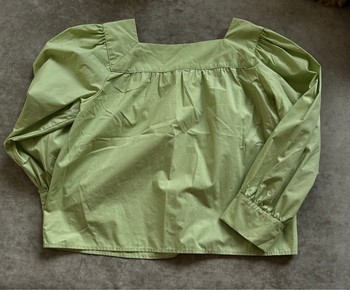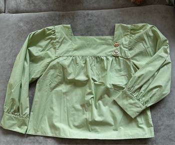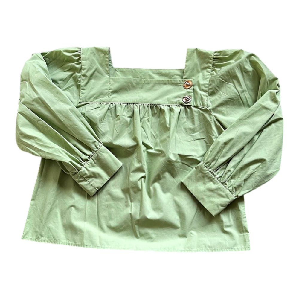 Mint green blouse with long sleeves and gold-tone decorative buttons on the shoulder. Features a square neckline and gathered fabric detail.