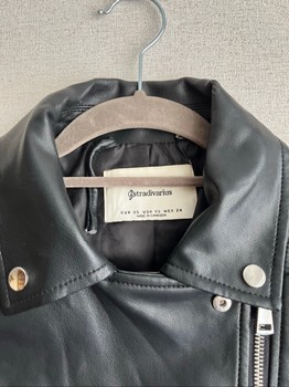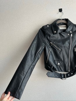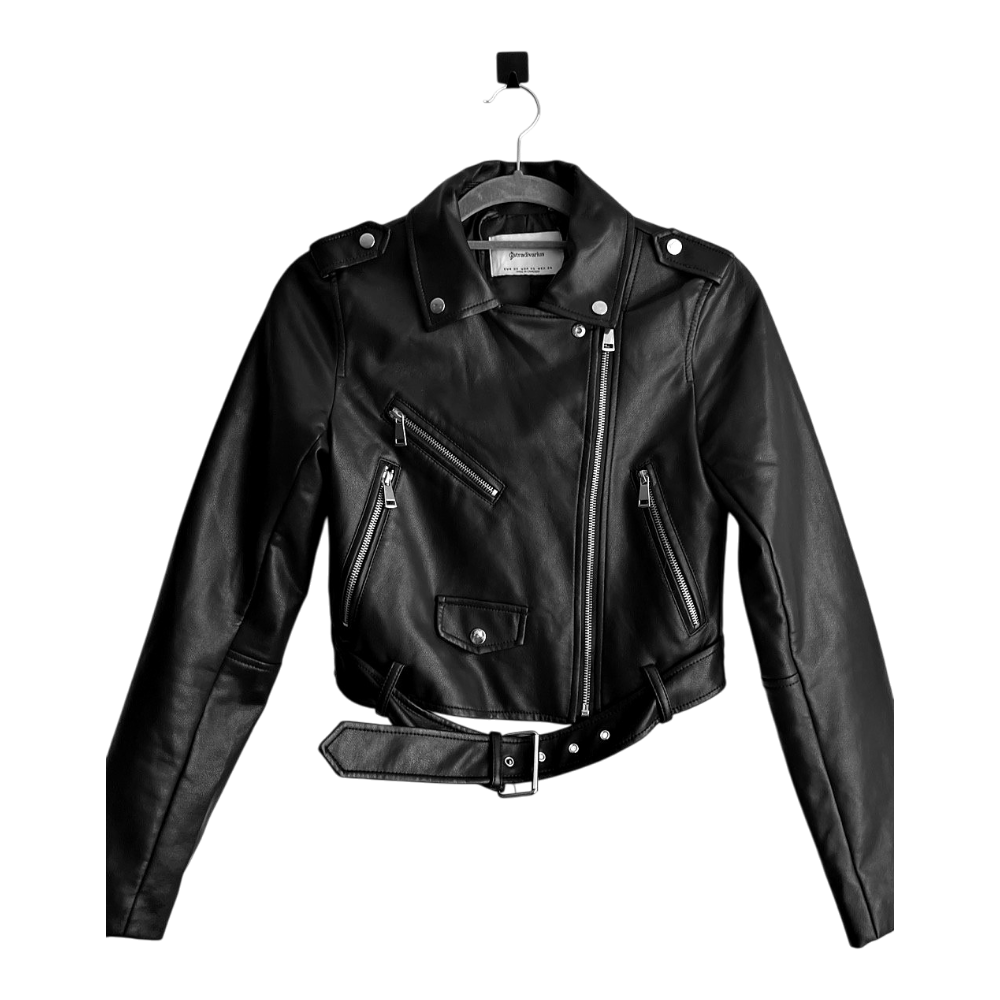 Black faux leather biker jacket with a belted waist and zipper closures. Features silver-tone hardware. Size XS.