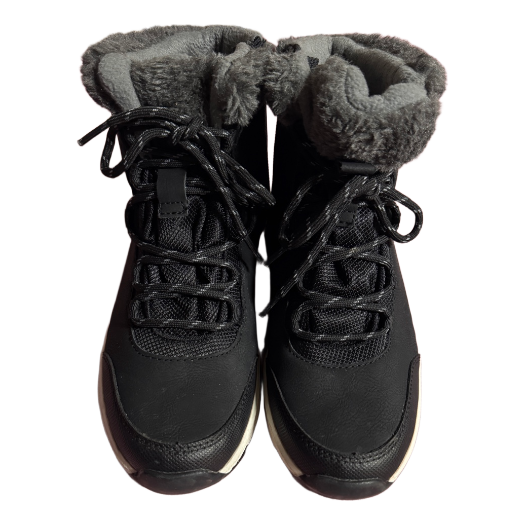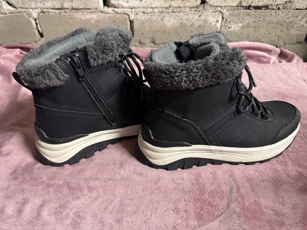 Black waterproof winter boots with grey faux fur lining and side zipper closure. Featuring a white sole and lace-up front.