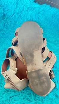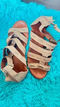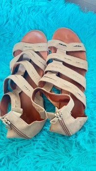 Beige gladiator sandals with a side zipper closure. Size 38.