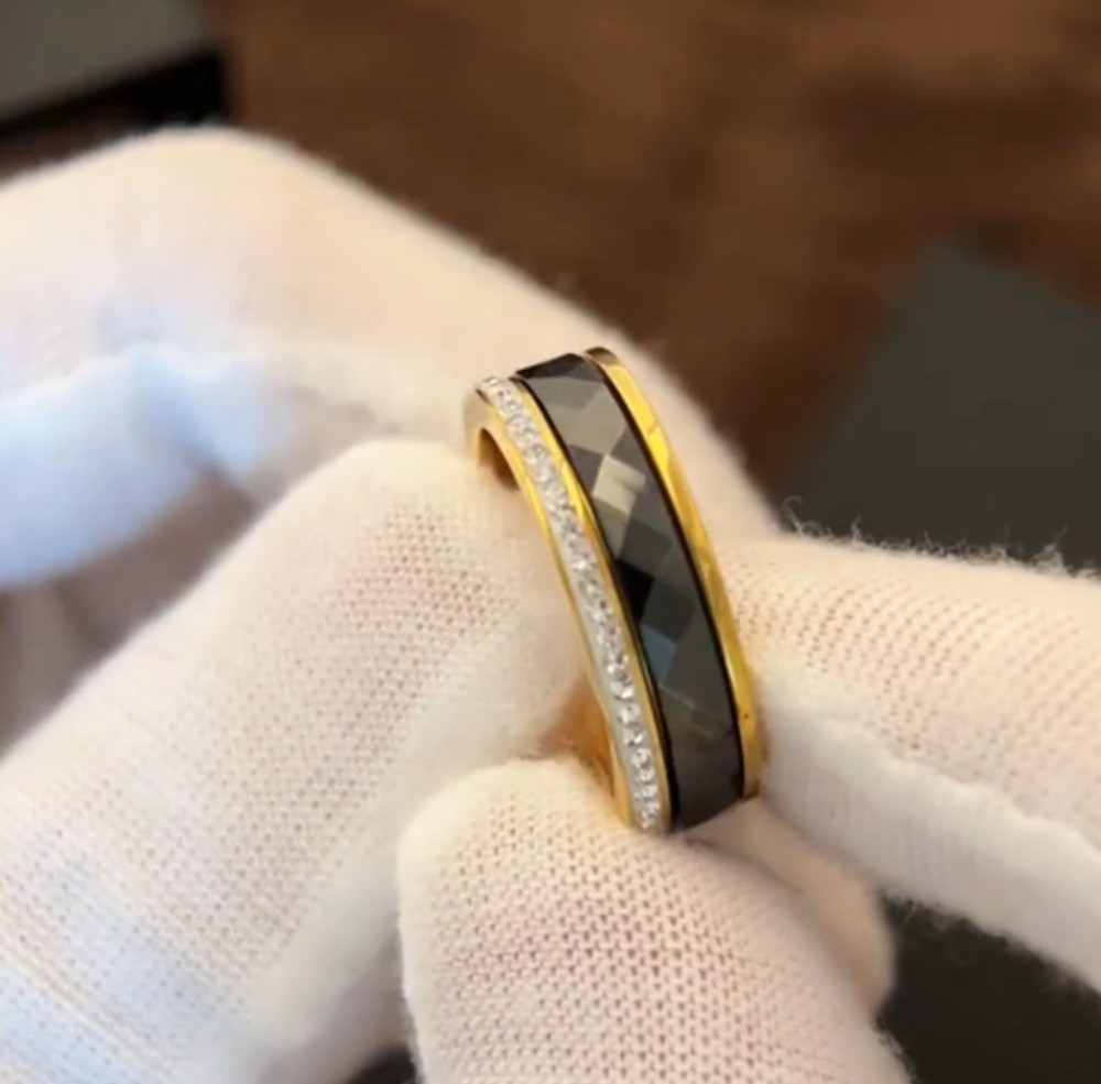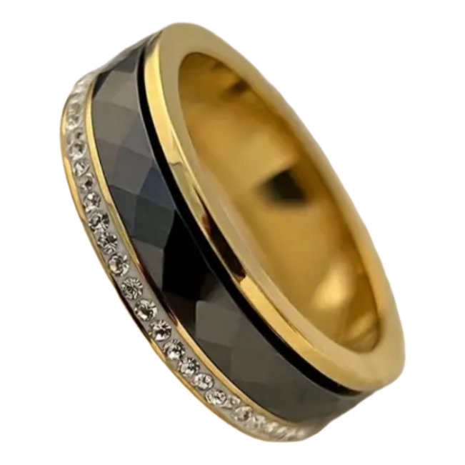 Ring with gold-colored stainless steel. Black ceramic faceted detail and small zirconia stones, size 18 mm.