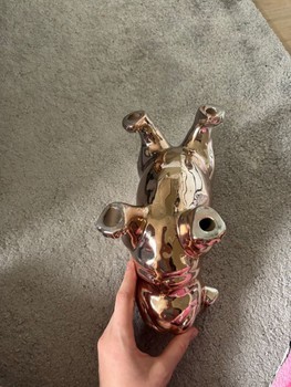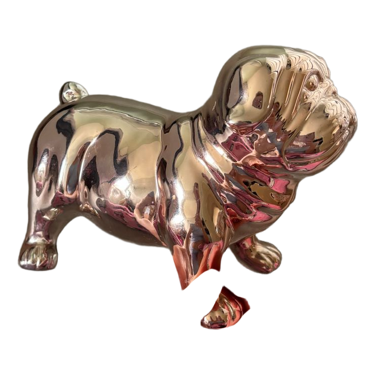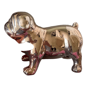 Golden, shiny-surfaced dog figurine.