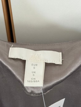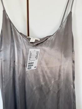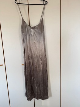 Satin midi dress in a metallic grey tone. Features thin spaghetti straps and a cowl neckline. New with tags. Size S.
