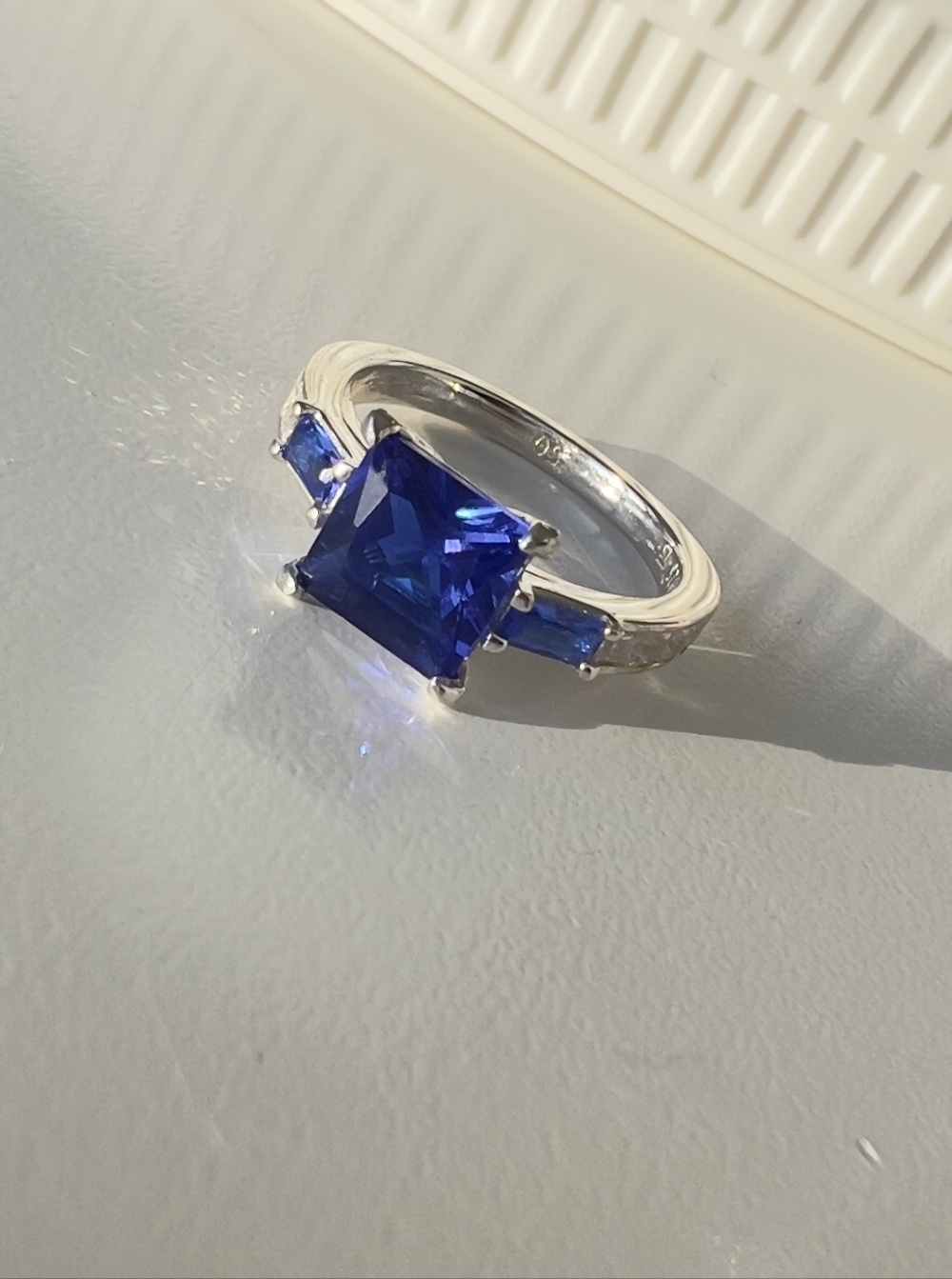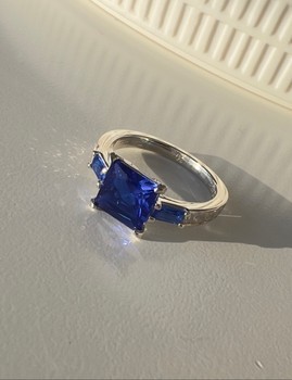 Silver ring with a large blue square stone and smaller blue stones on the sides. Marked with brand name on the inside, size 50.