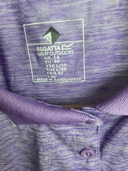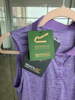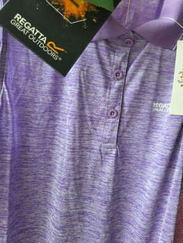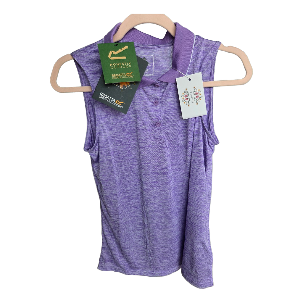 Sleeveless polo shirt in purple. Features a button-up neckline and brand logo. New with tags. Size 40.
