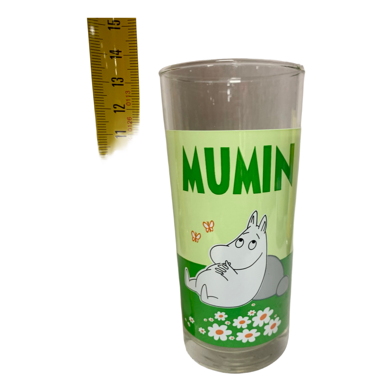 Clear glass tumbler featuring Moomin character illustration and daisies. Height is approximately 14.5 cm.