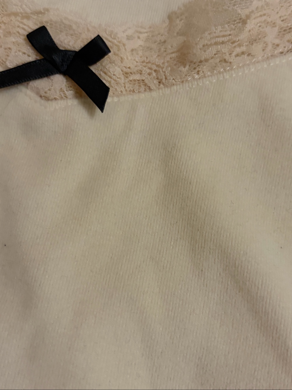 Long-sleeved top in a cream color with lace trim at the neckline and a small black ribbon detail.