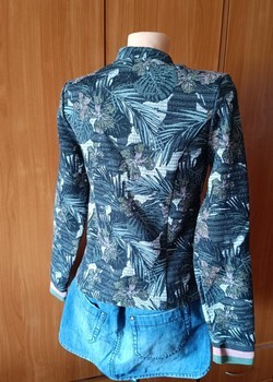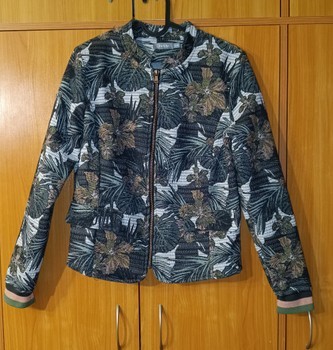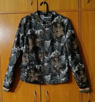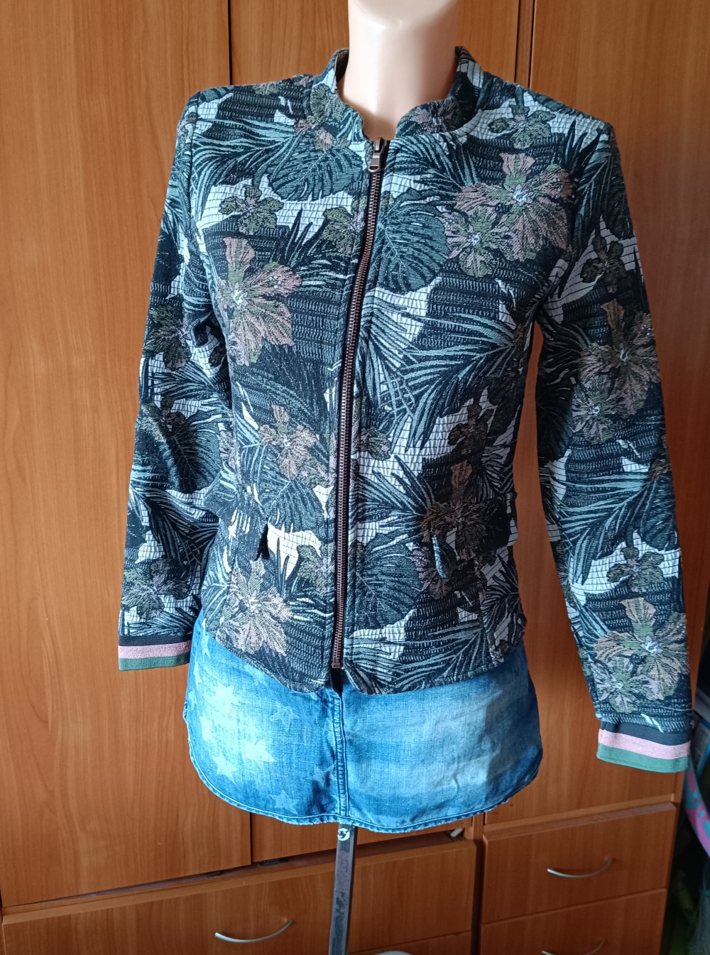 Textured bomber jacket with a tropical floral pattern. Features a front zip closure and ribbed cuffs. Size S/36.