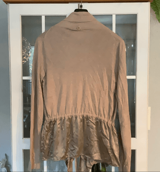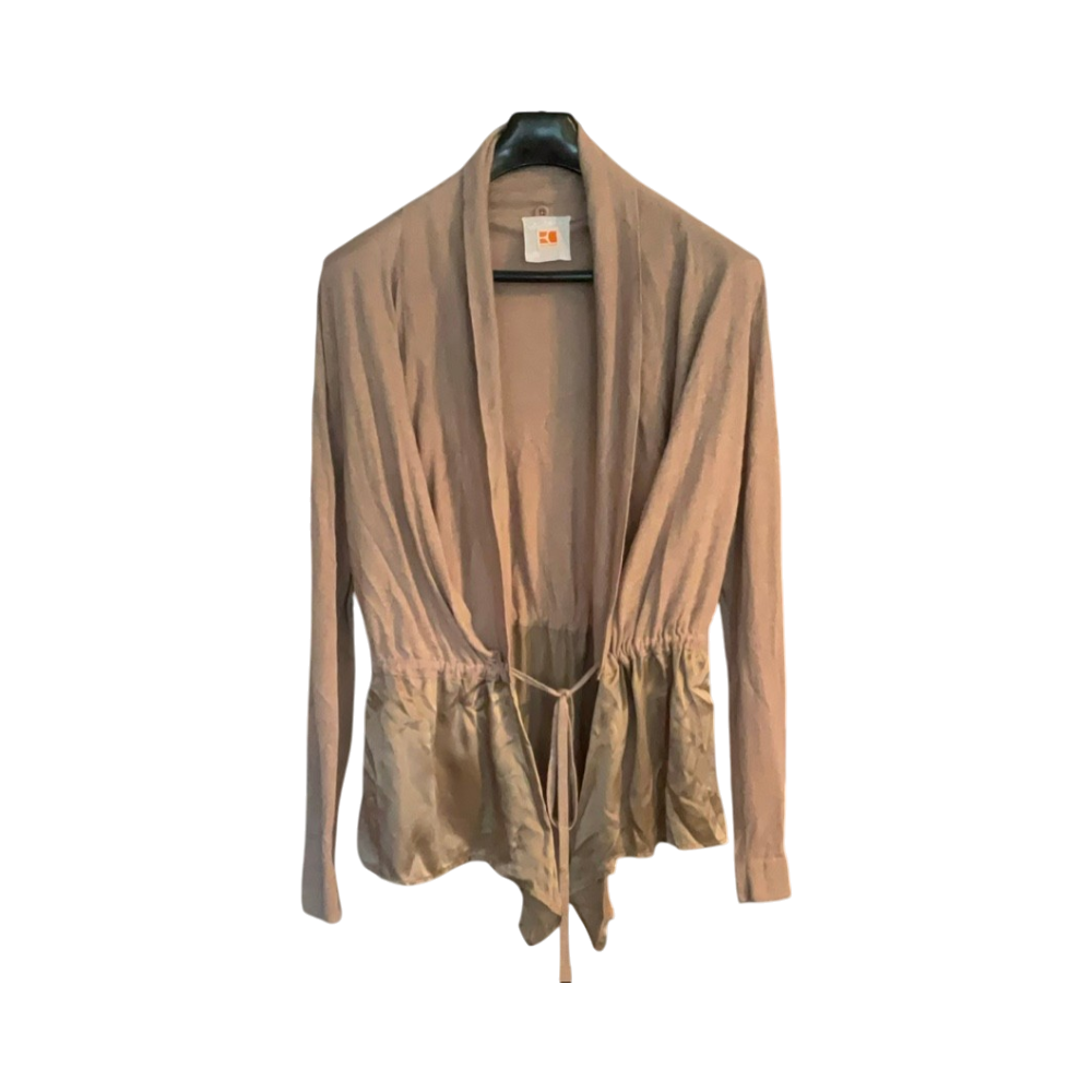 Nice beige cardigan, with a belt and a shiny hem at the bottom. Cotton, viscose, silk.