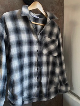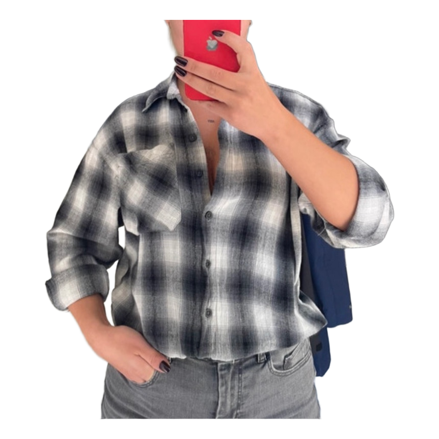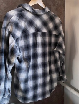 Subtle grey plaid flannel with a hint of deep blue. Excellent condition. Very soft fabric and casual fit. Zero flaws.