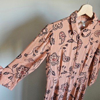Beautiful dusty pink base with black and subtle red floral/paisley pattern. Lightweight, breathable and flowy fabric – perfect for everyday wear, summer days, or a relaxed capsule wardrobe.