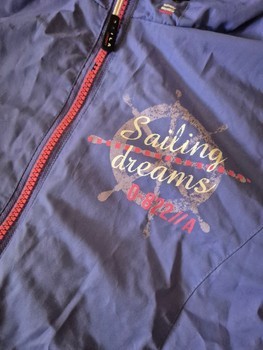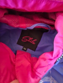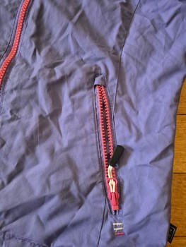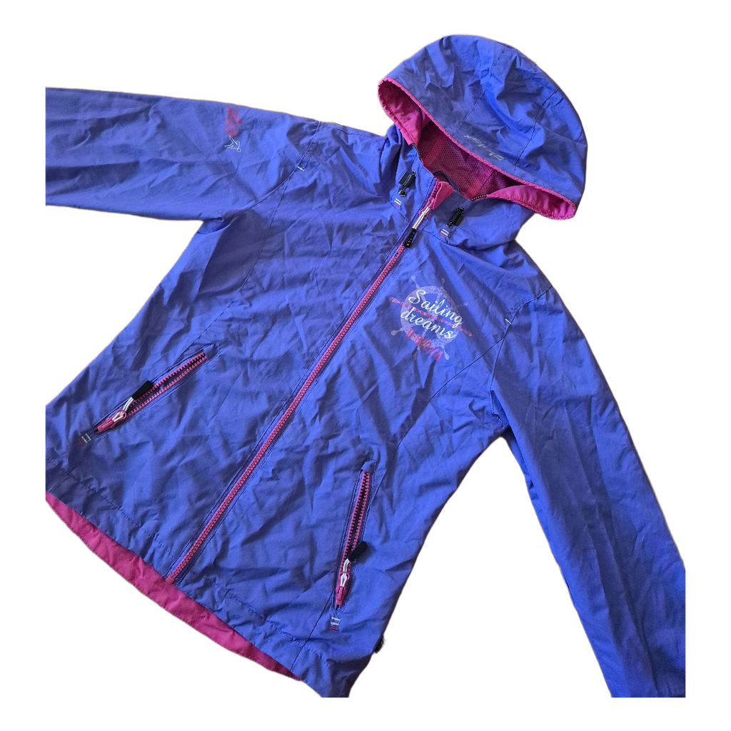 Purple windbreaker jacket with pink accents and a hood. Features zipped side pockets. Size 140.