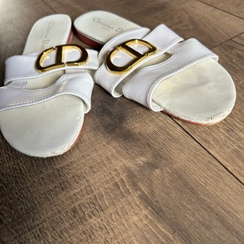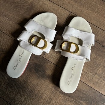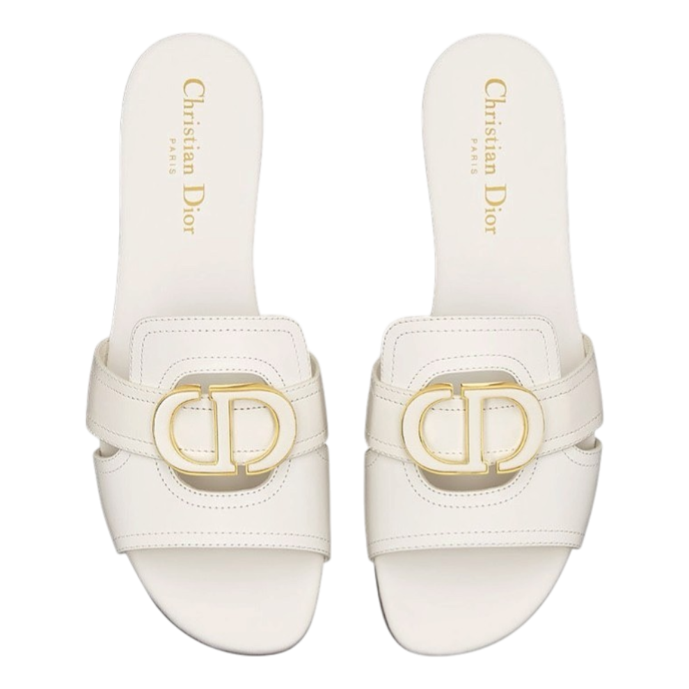 White slides with a wide strap featuring a gold-tone 'CD' logo buckle. The insole prominently displays the Christian Dior brand name.