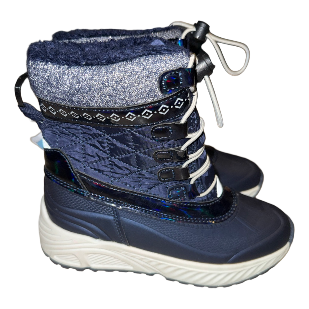Quilted winter boots in navy blue with a faux fur lining and thick rubber soles. Featuring a toggle lacing system and iridescent trim.