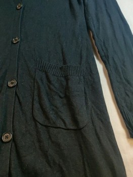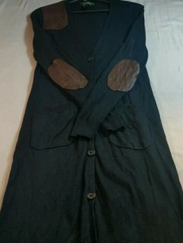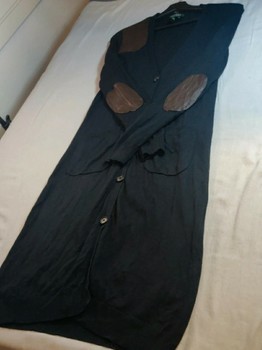 Lovely maxi-length black cardigan. The knit has leather elbow patches and a leather detail on the right shoulder.