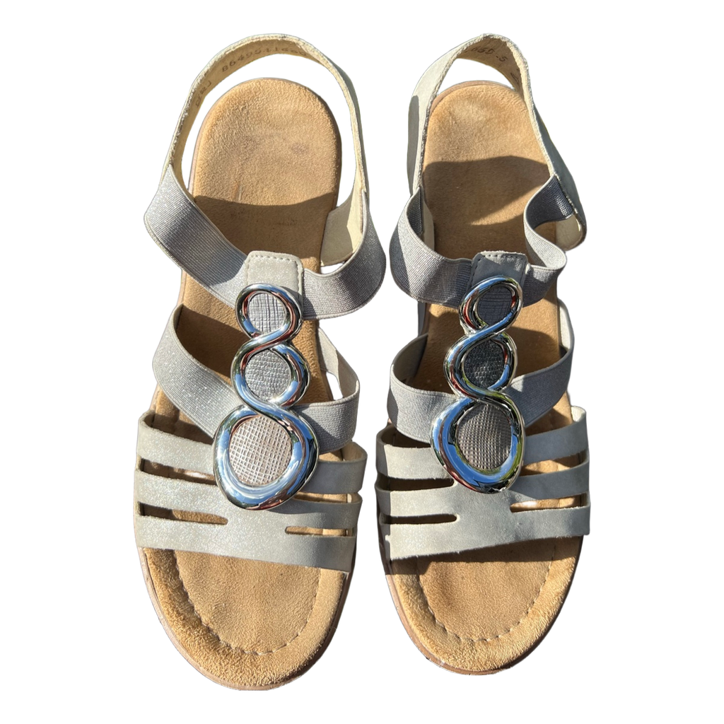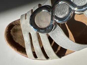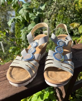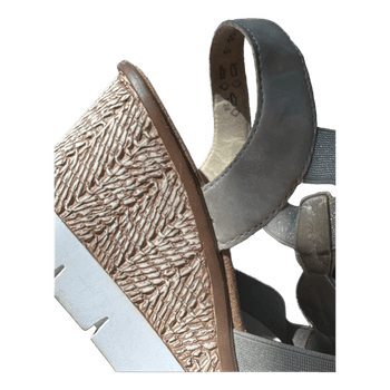 Good condition, lightly used Rieker wedge-heel sandals, size 39. Color glittering pearl grey. Wonderfully soft on the foot, two wide snugly elastic rubber bands keep the sandals well on the foot. Insole length 25 cm, forefoot width 8.5 cm, heel 8 cm (incl. white sole thickness 2.5 cm). Model no 8649511660
