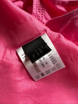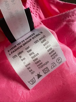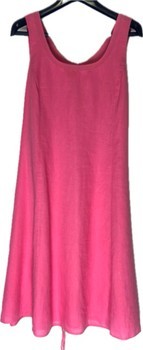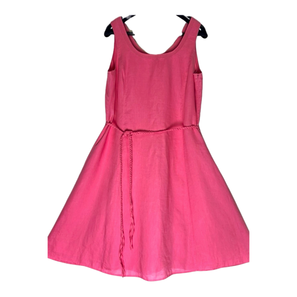 Completely candy Barbie pink, nearly like new, worn a couple of times, lined A-line Ril’s linen dress, size 42. Outer fabric 100% linen, lining 100% acetate. Gentle wash 30C. Length from nape seam to hem 88 cm, shoulder width 34 cm, width at underarm 53 cm, waist width 56 cm, hem width approx. 100 cm. Braided belt 210 cm. 34 cm zipper in left side seam.