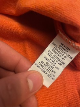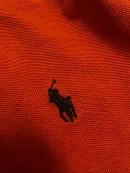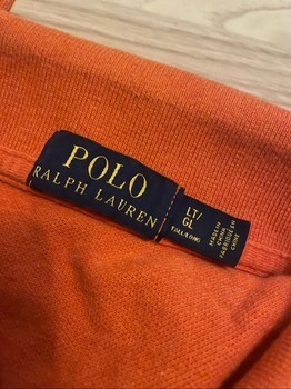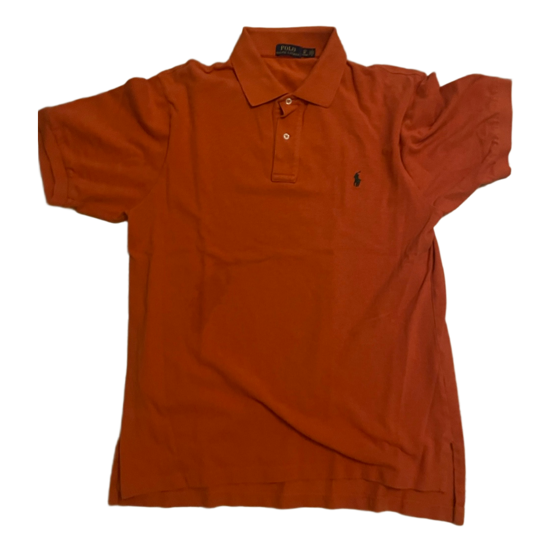 Orange short-sleeved polo shirt with a button placket and an embroidered logo. Made from 100% cotton, size LT.