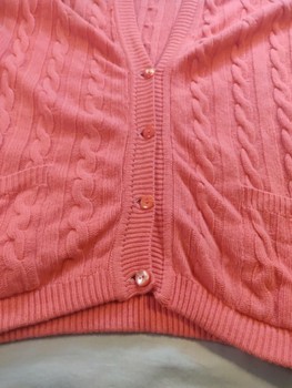 Beautiful women's long cardigan in a coral/salmon pink shade. The knit has a classic cable pattern, large pockets and a comfortably relaxed, long fit. Soft and warm.