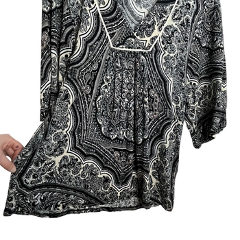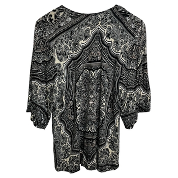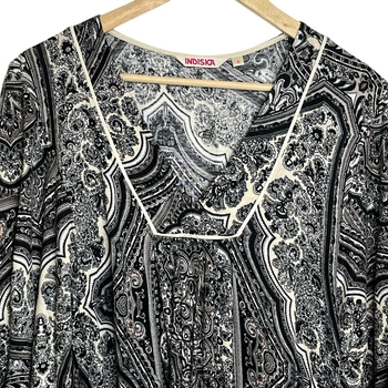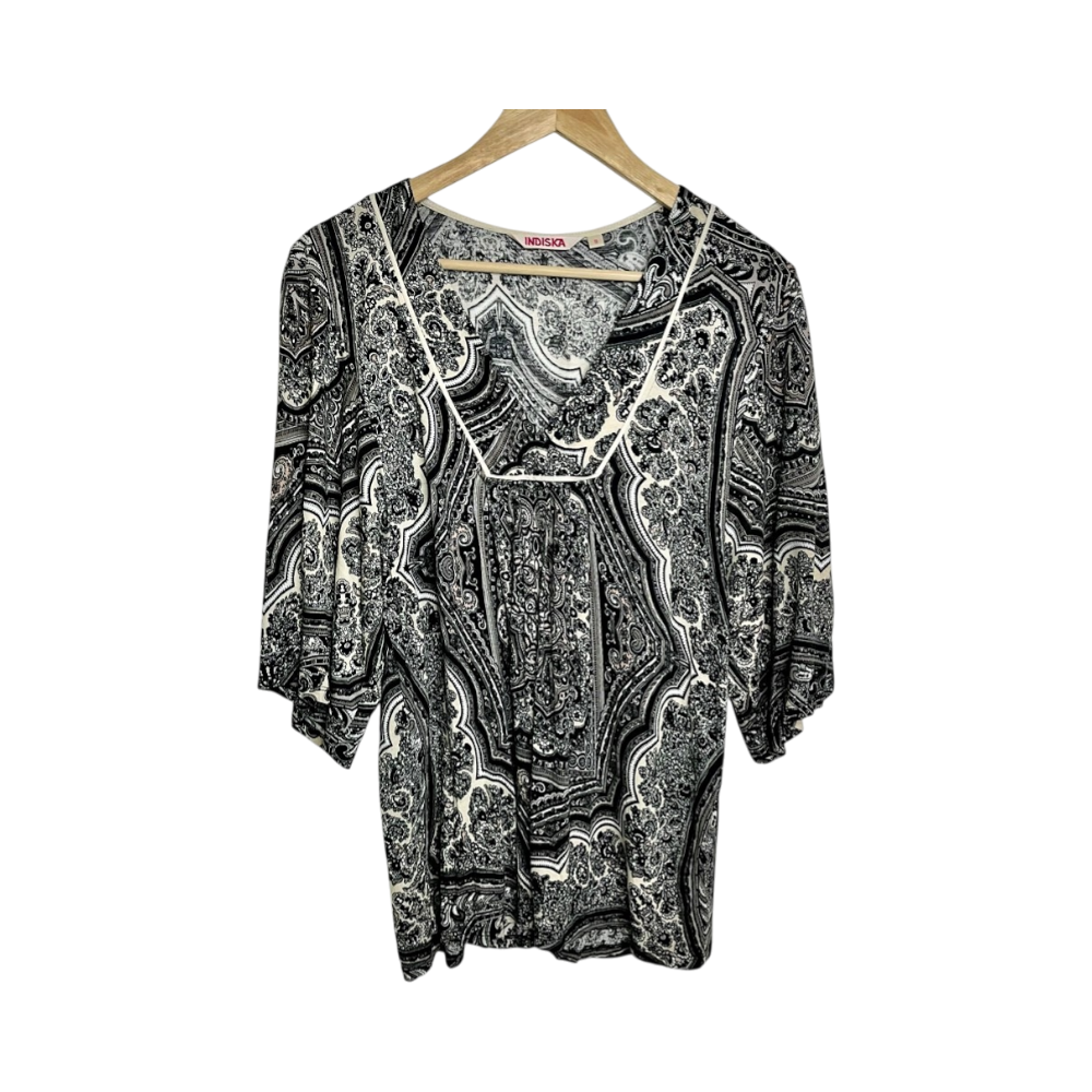 Indiska black, gray, beige tone paisley print blouse in womens size S. Feminine ruching on the front and 3/4 sleeves. Airy, flowy, stretchy and soft fabric. Excellent pre-owned condition, no signs of wear. Measurements: shoulders 38-39cm, chest 47cm, sleeves 36cm, item length 69cm.