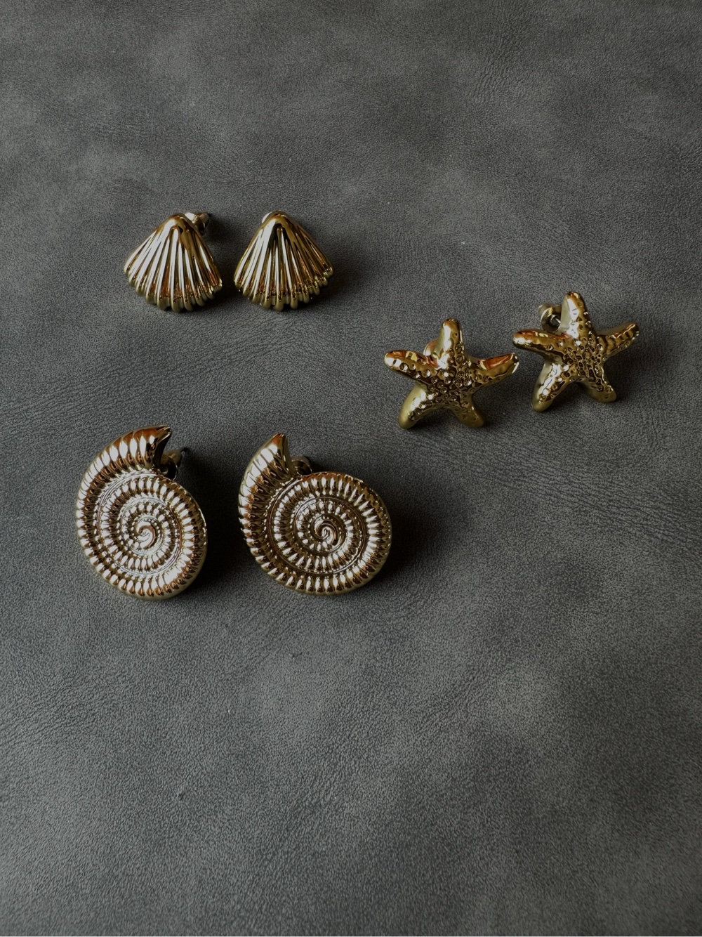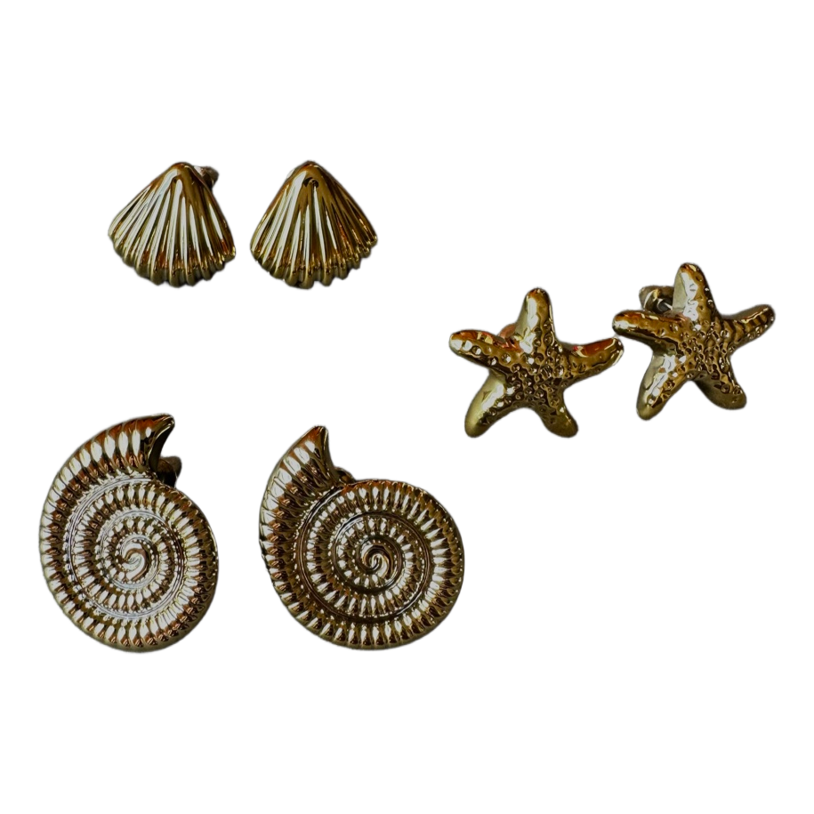 Three pairs of gold-tone stud earrings featuring shell, starfish, and ammonite designs. They are very lightweight!