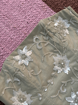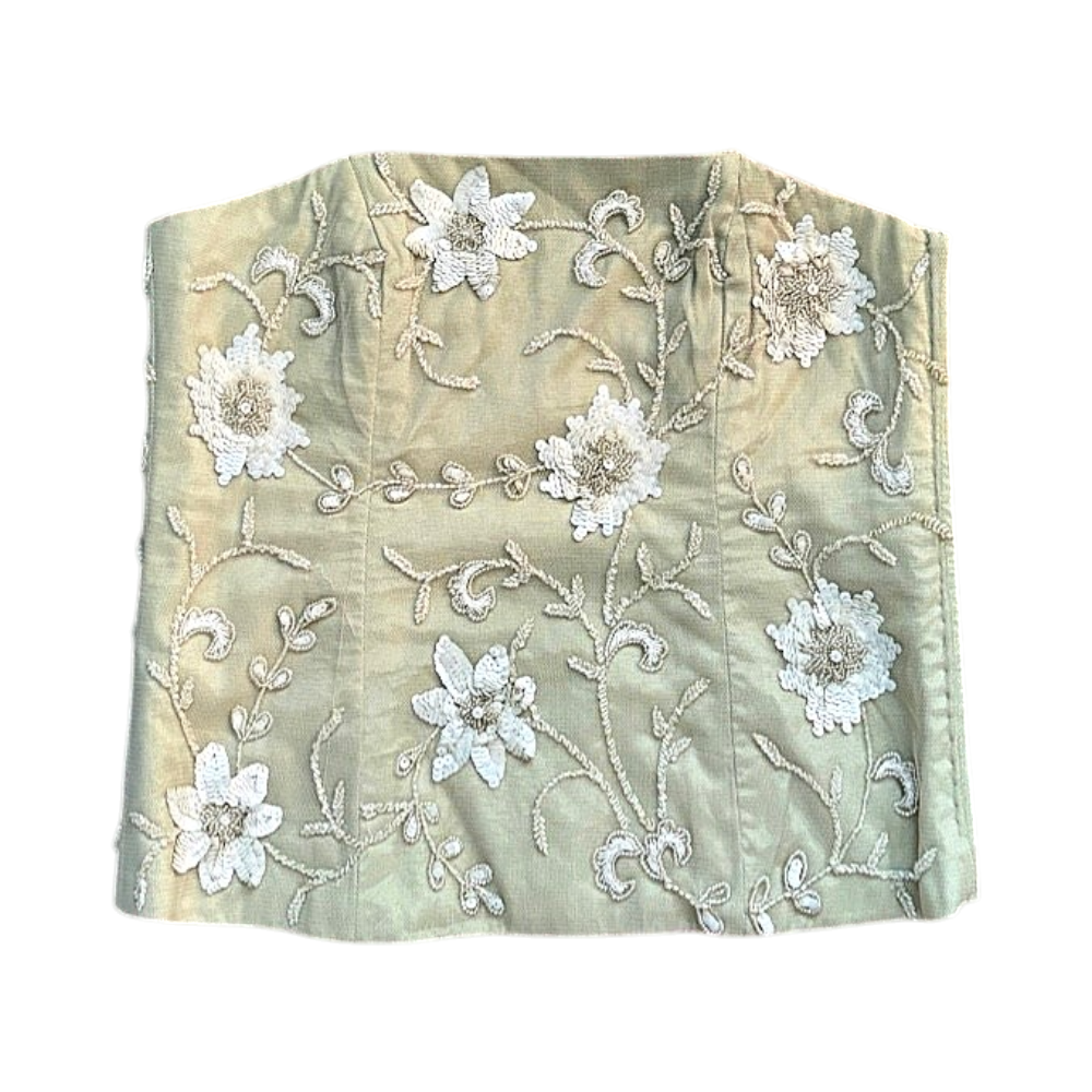 Pomodoro-branded vintage corset top 💮 Size UK10 and fits true to size; shoulder-to-hem approx 36 cm and armpit-to-armpit approx 40 cm. Beautiful floral embroidery with sequins. The top has boning and a side zipper.