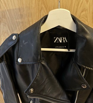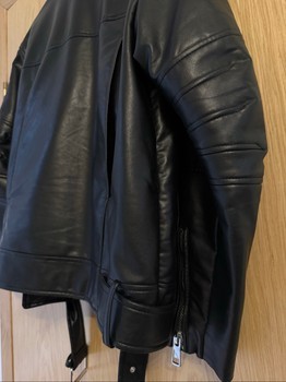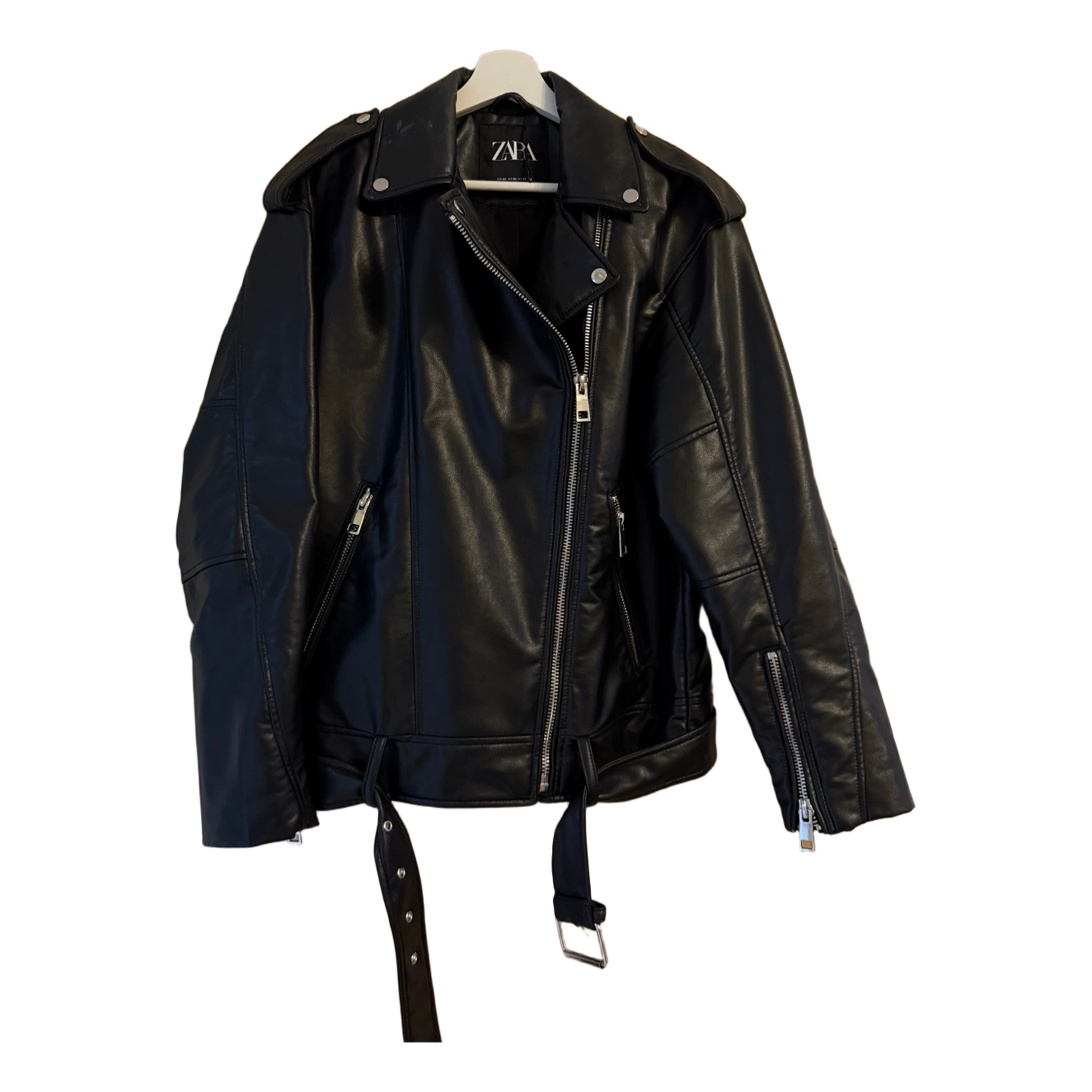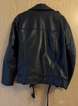Faux leather biker jacket with a belted waist and silver-tone hardware. Zipper detailing on sleeves. Size XS.