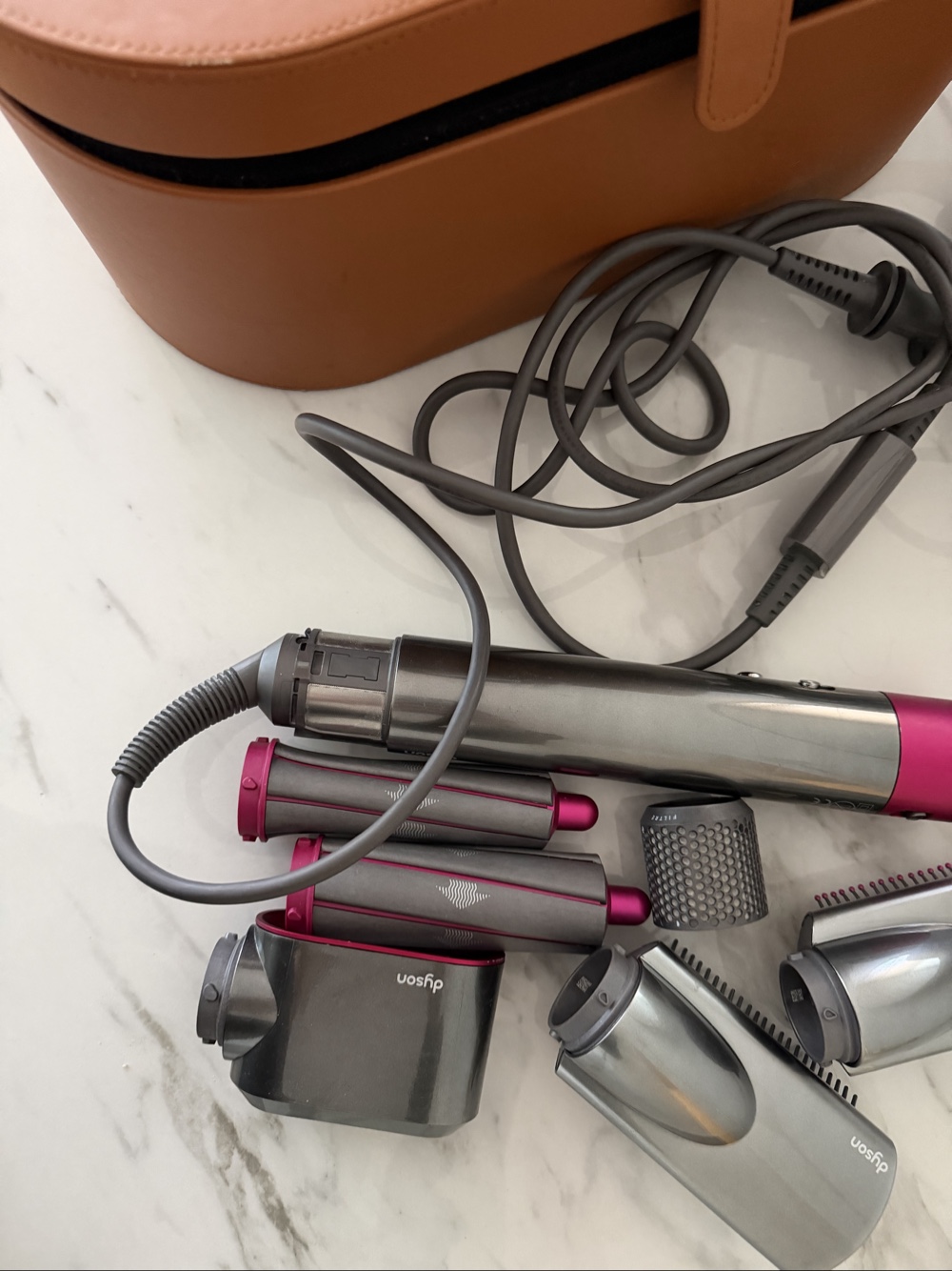Dyson Airwrap hair styler with storage case. Includes several different styling heads. Two are missing from the curlers, but I have still managed to curl by changing hand position. Parts can also be purchased online. No longer in perfect condition, but still works. Original storage box included as well.