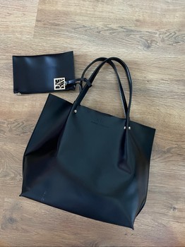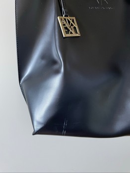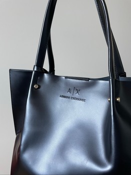 Black tote bag from Armani Exchange with a matching pouch. Features embossed logo and gold-tone hardware.