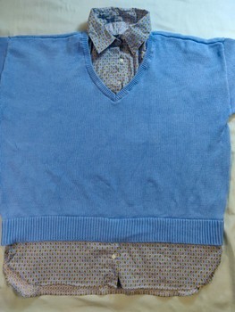 Stylish women's 2-in-1 knit top combining a knit and a button-down shirt. The knit part is blue and the collar and hem parts have a classic paisley pattern.