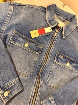 Blue zip-up denim jacket with two chest pockets and a folded collar. Includes brand tag, size S.