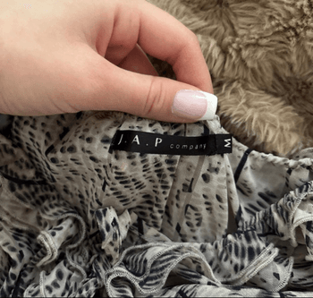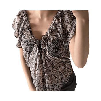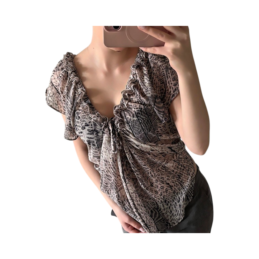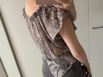 Lightweight top, which has patterned fabric. It has a V-neck opening and gathers.