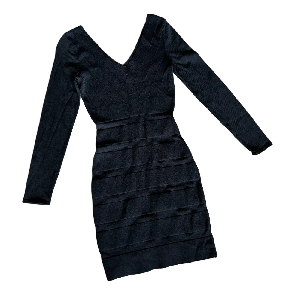 Black long-sleeved bandage dress with a deep V-neckline.