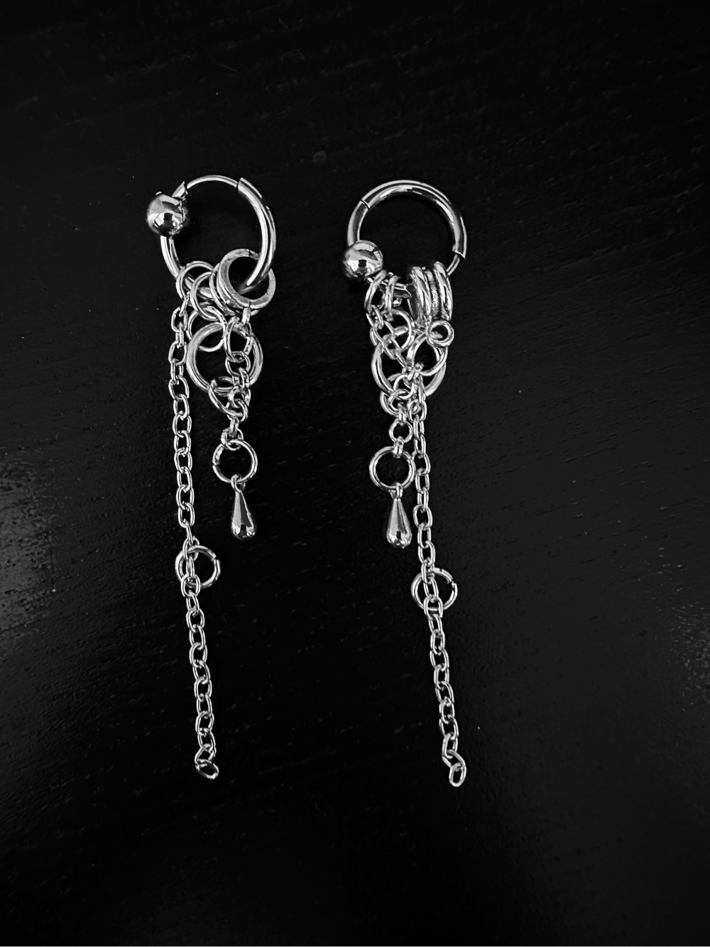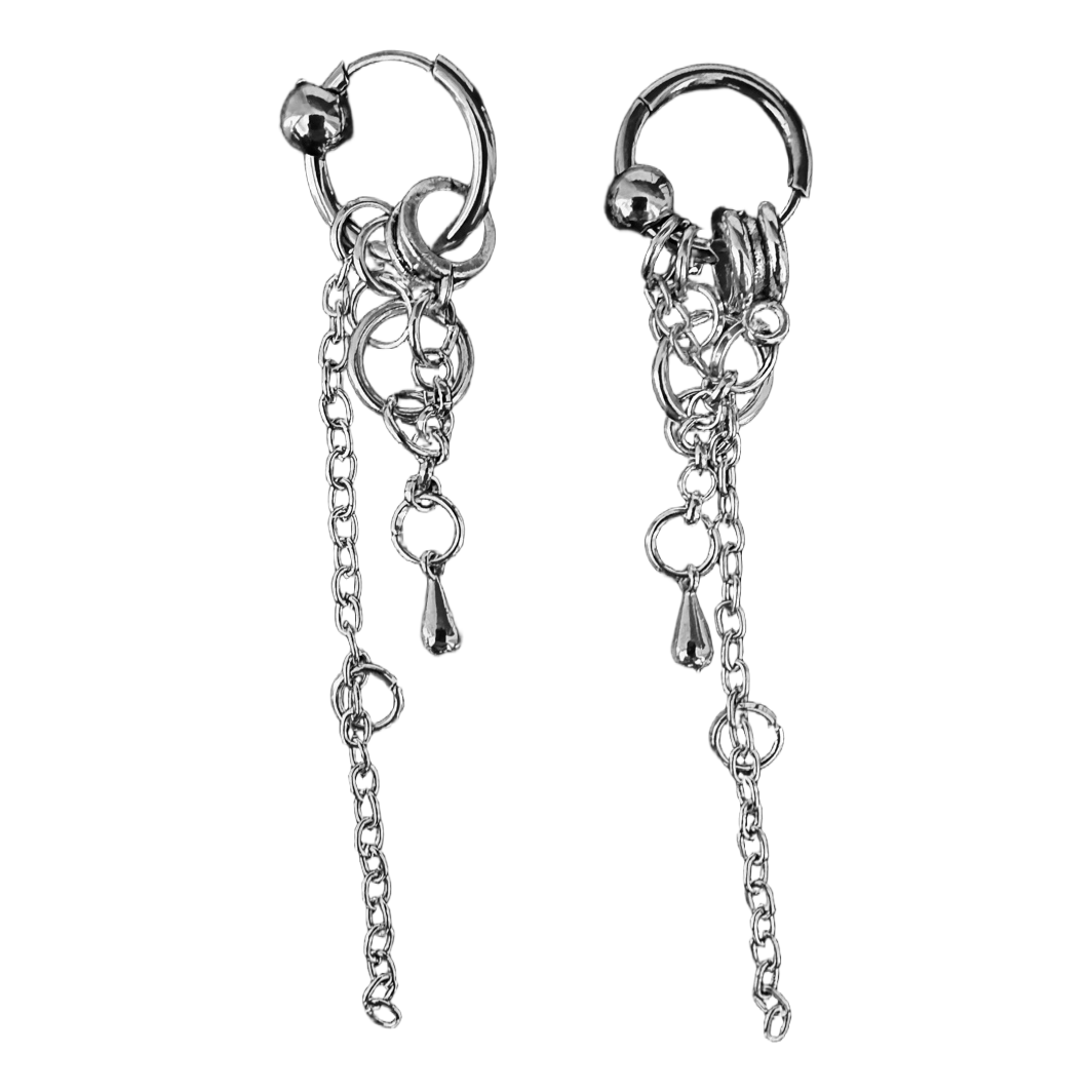 Silver-toned drop earrings featuring multiple hanging chains and rings attached to a hoop. Minimalist design.
