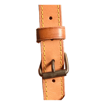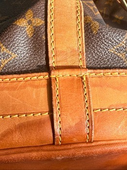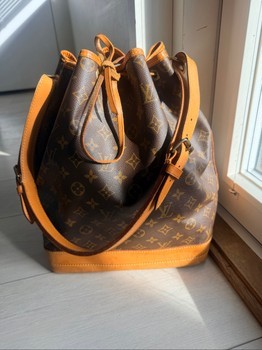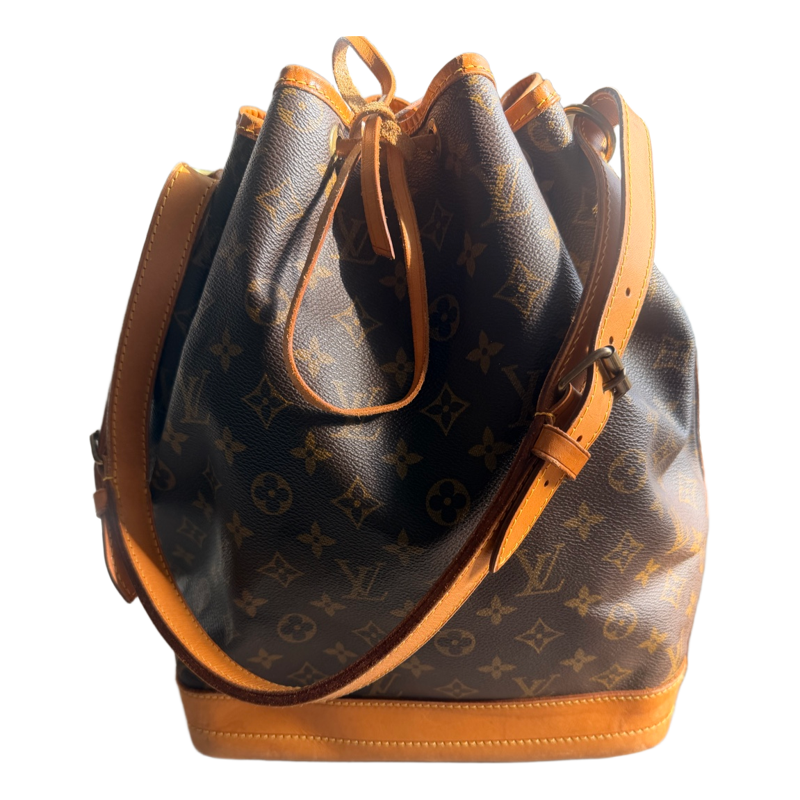 Monogram canvas bucket bag with adjustable leather strap and vachetta leather trim. Iconic brown pattern with gold-tone hardware.