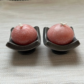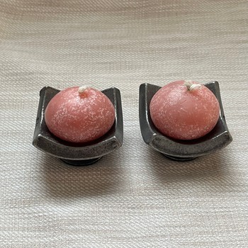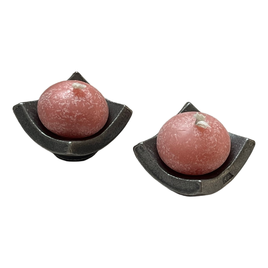 Two small dark gray metal candlesticks and matching light pink candles.
