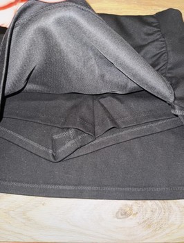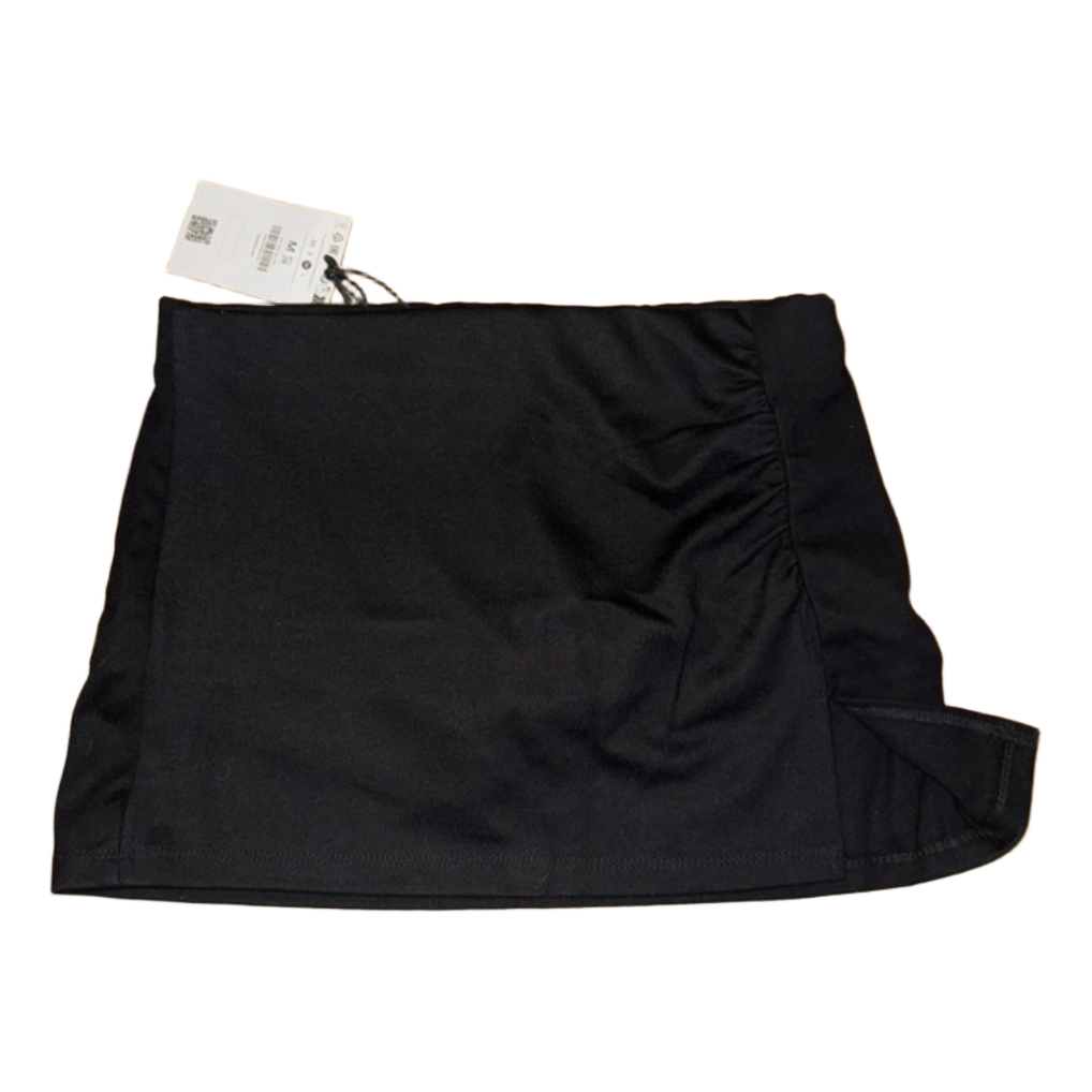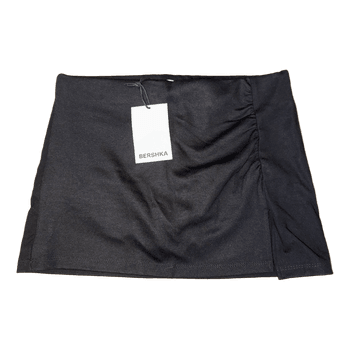 Black mini skirt featuring a ruched side detail and a slit. Size M, new with tags.