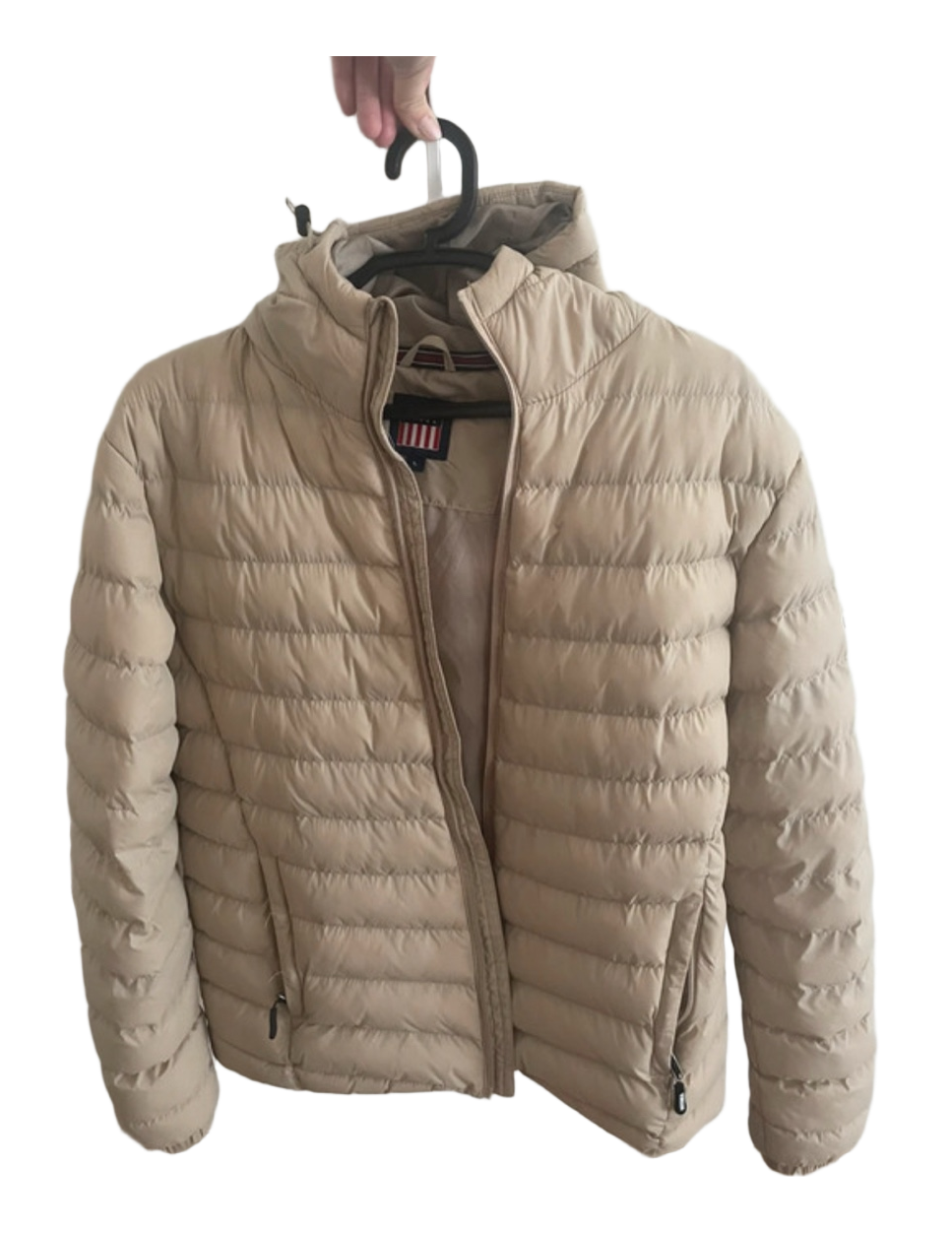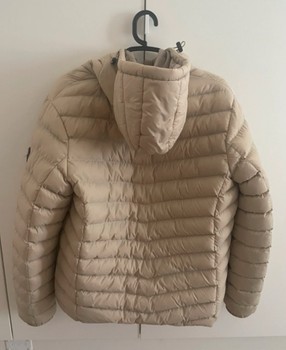 Beige-colored lightly padded jacket with hood and zipper. Bought from Stadium.