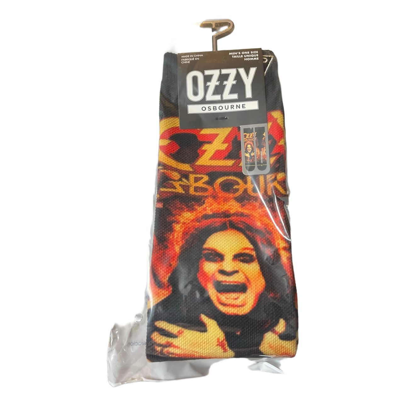 Black Ozzy Osbourne-themed socks. One size, new with product tags.