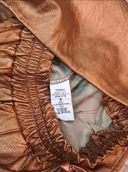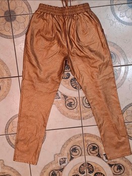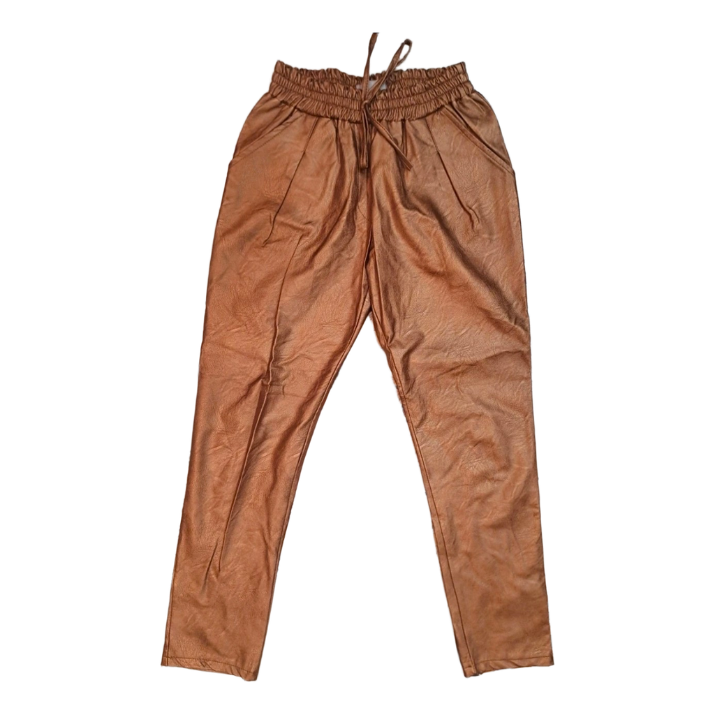 Bronze trousers with an elasticated waistband and drawstring. Made of 50% polyester and 50% polyurethane. Size S.
