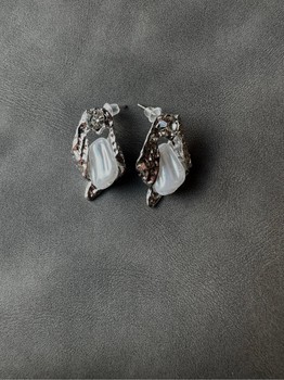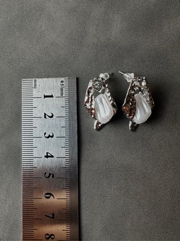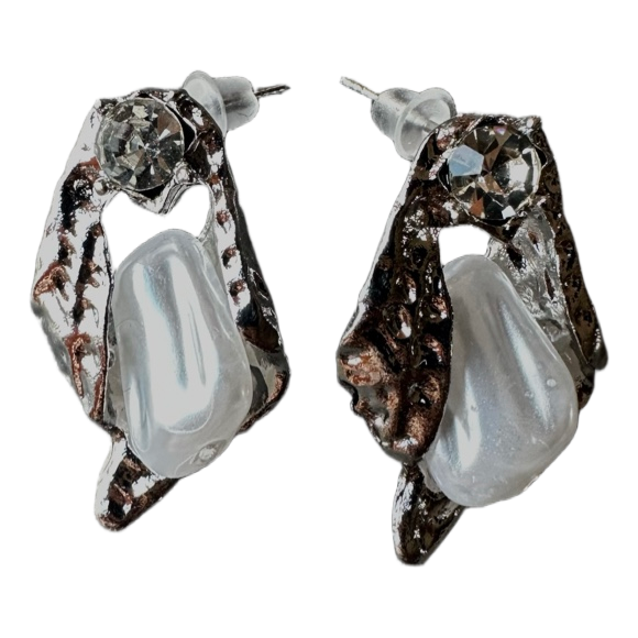 Silver-tone earrings featuring a textured metal frame, a single clear stone, and an irregular white pearl-like bead. Includes plastic backing.