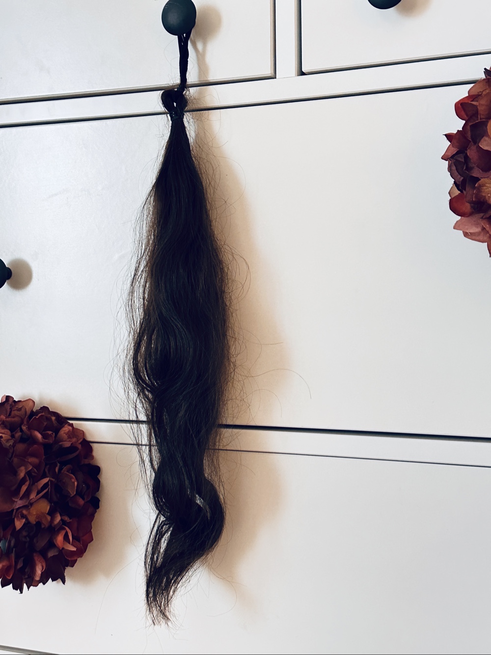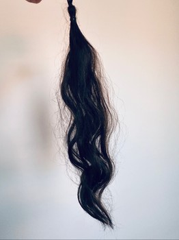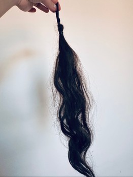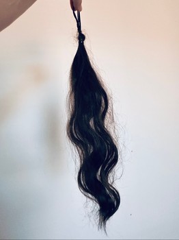 Dark brown, real hair extension as a ponytail. Naturally wavy texture.