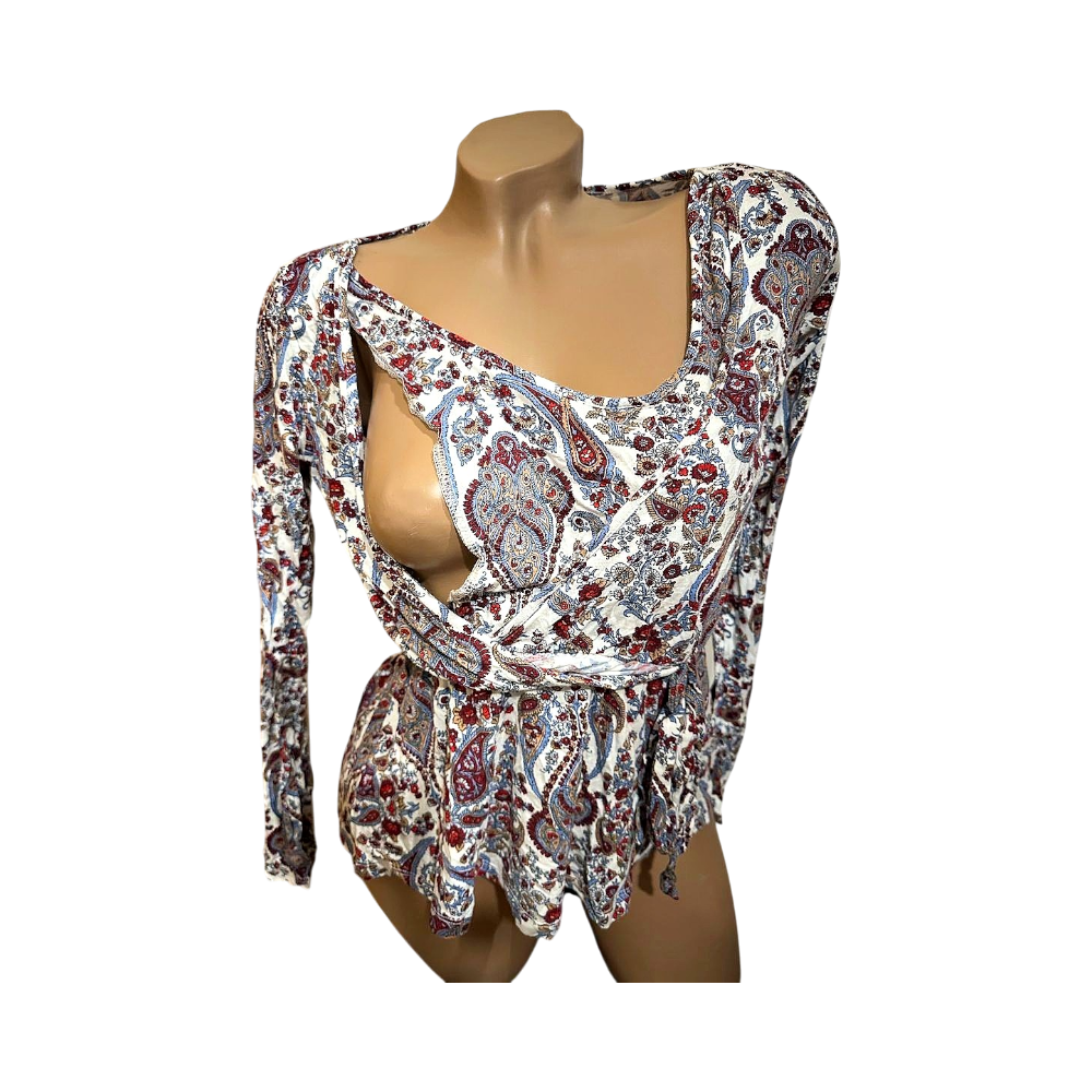 Long-sleeved top featuring a multicolor paisley print and a tie detail at the waist. Soft, lightweight fabric for a comfortable fit.