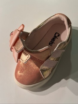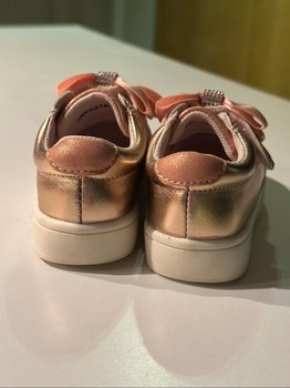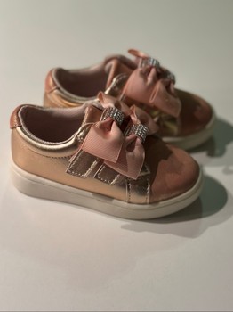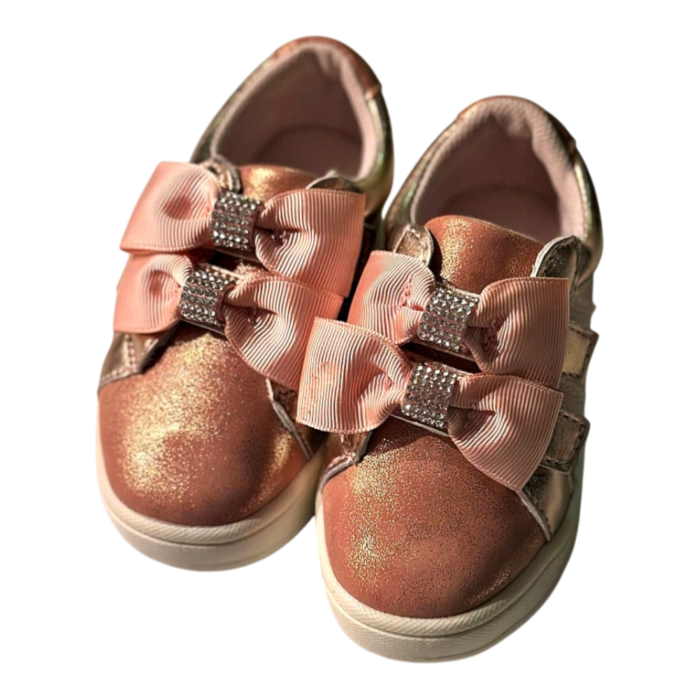 Rose gold sneakers with pink bows. Features sparkly embellishments on the bows. White soles. Insole 14cm