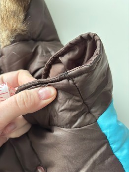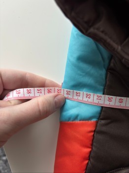 Size approximately M, girth 54 cm, length from neck 40 cm. There is a hole sewn on the sleeve, not very noticeable.