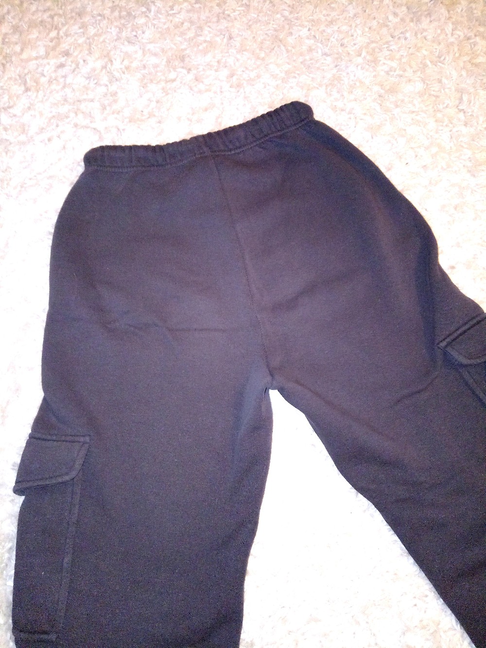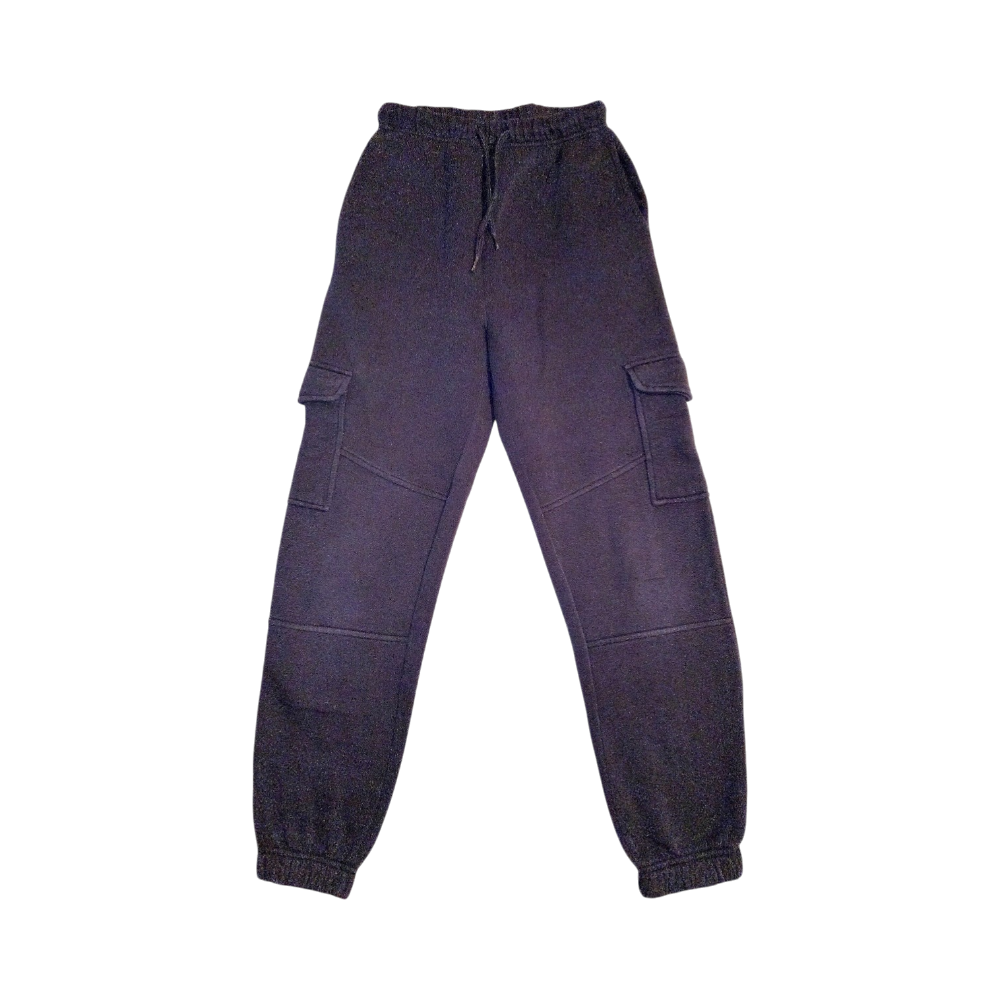 Dark gray cargo pants with an elastic waistband and drawstring. Thigh pockets at the sides. Elastic ribbed cuffs at the leg openings.