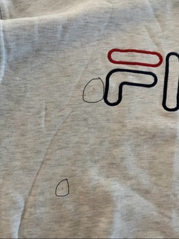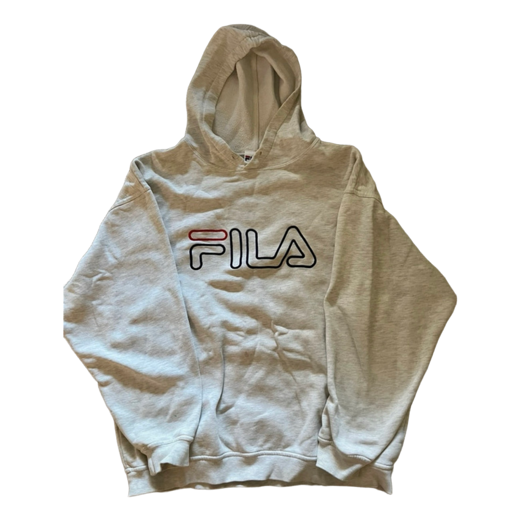 Grey Fila hoodie, with embroidered logo on the front. The hoodie has signs of use and small stains.