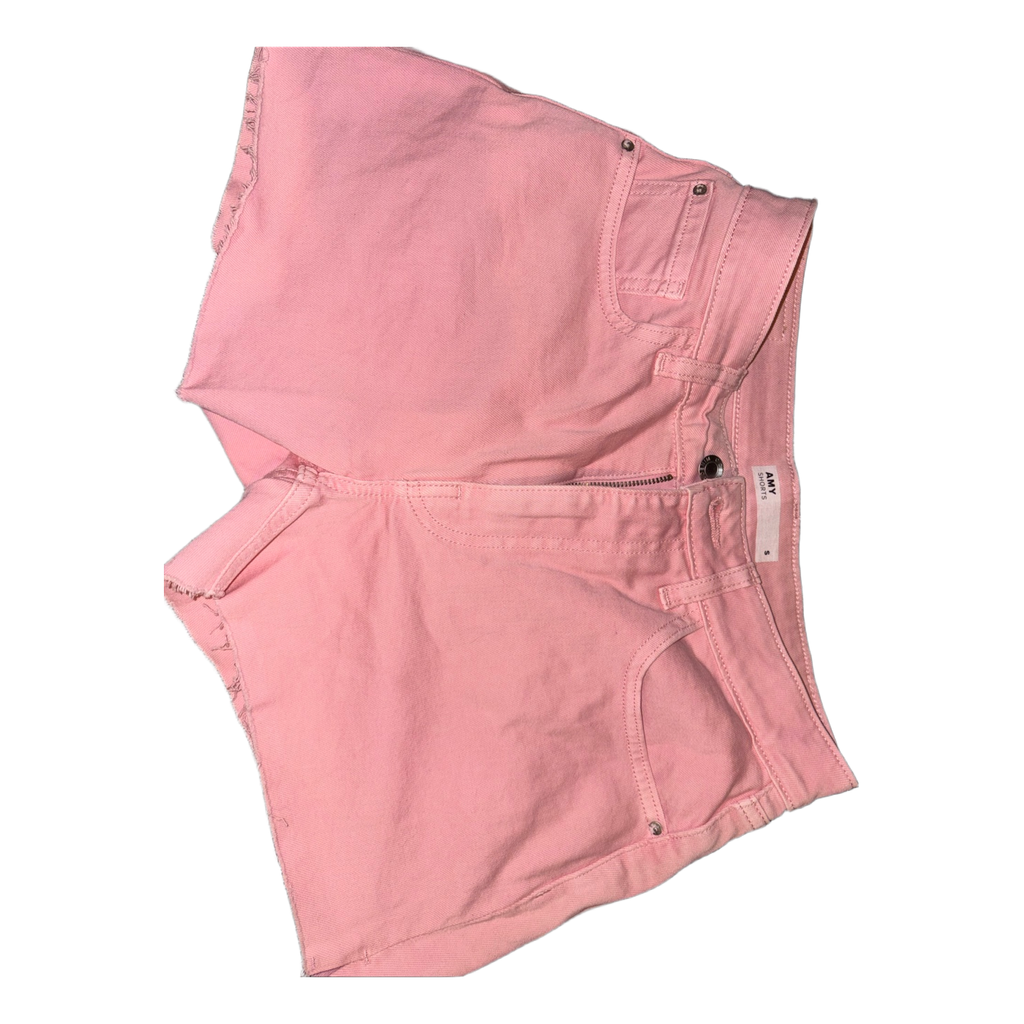 Light pink denim shorts with distressed hems. Size S.