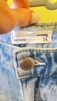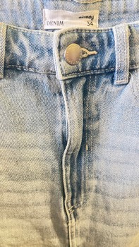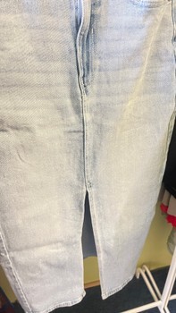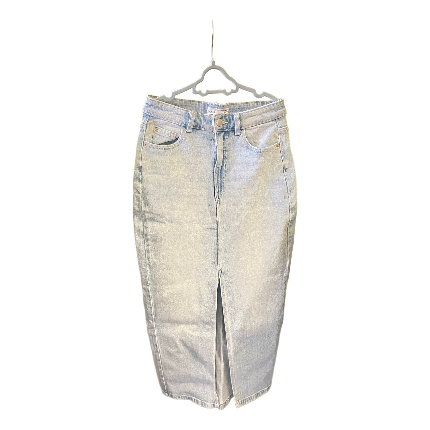 Light blue denim midi skirt with a front slit. Features five pockets and a button-fly closure. Size 34.